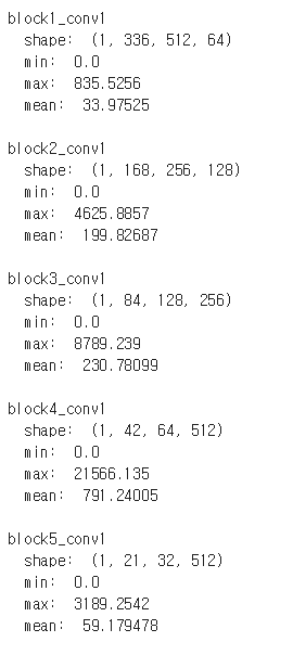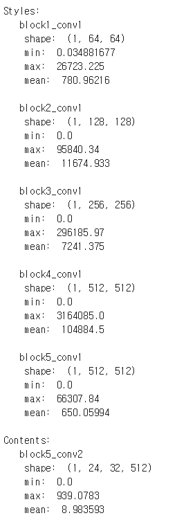 block5-conv2는 인풋 레이어에서 멀기 때문에 content에 가깝고, 스타일 레이어는 다양하게 추출한 것을 볼 수 있습니다.