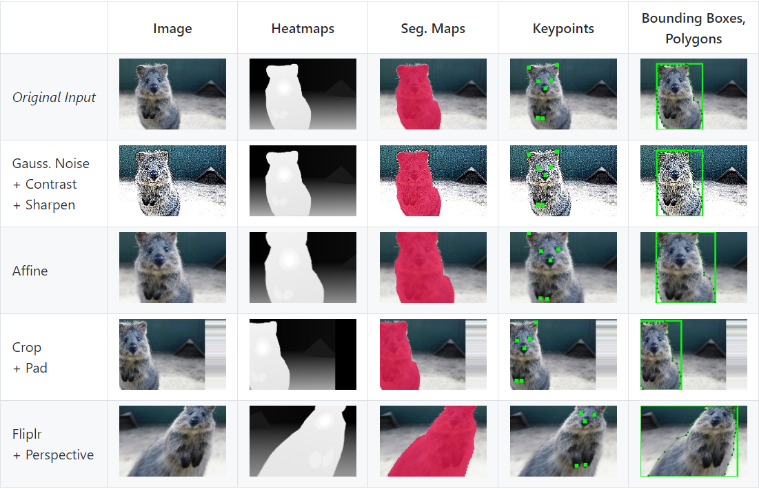 imgaug의 가장 좋은 점은 단순히 데이터를 회전, 노이즈, 확대 등을 할 수도 있지만 anchor box, heatmaps, seg.Maps, Keypoints 등도 같이 적용할 수 있다는 점입니다.
