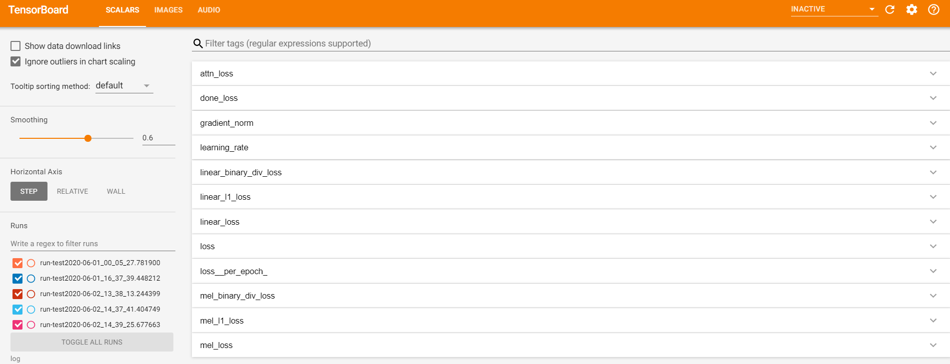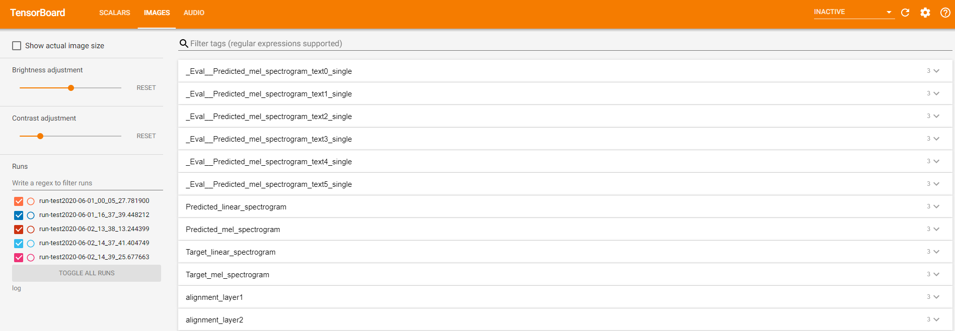 Images 배너에서는 Target 음성의 Mel / Linear spectogram과 Prediction 스펙토그램을 비교해볼 수 있습니다.