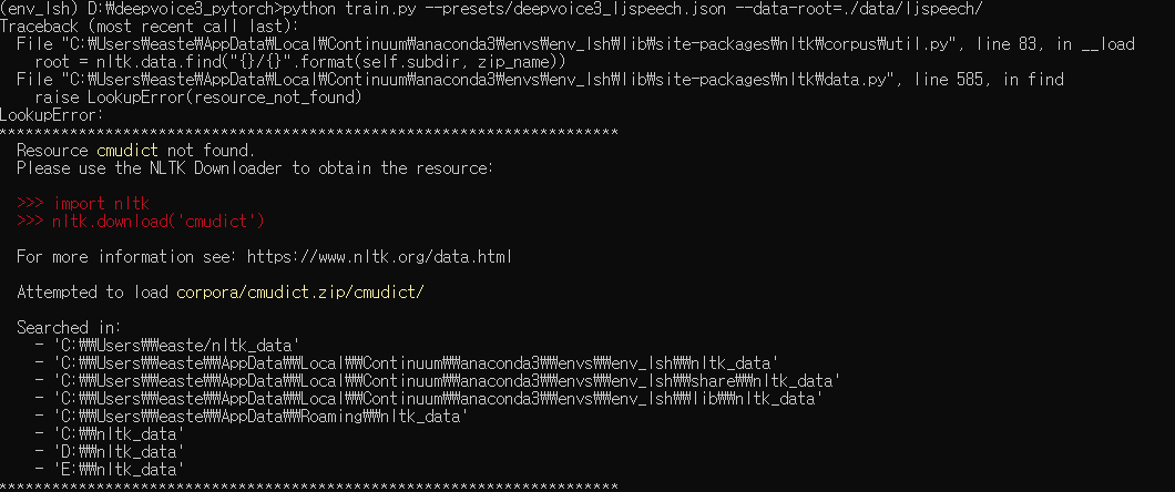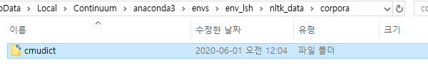 이런 경우에는 Searched in 에 있는 디렉토리에 nltk_data 폴더를 새로 생성하고 그 아래 corpora 라는 이름의 폴더 생성후 아래 링크에서 cmudict.zip 을 다운 후 압축해제 하면 됩니다.